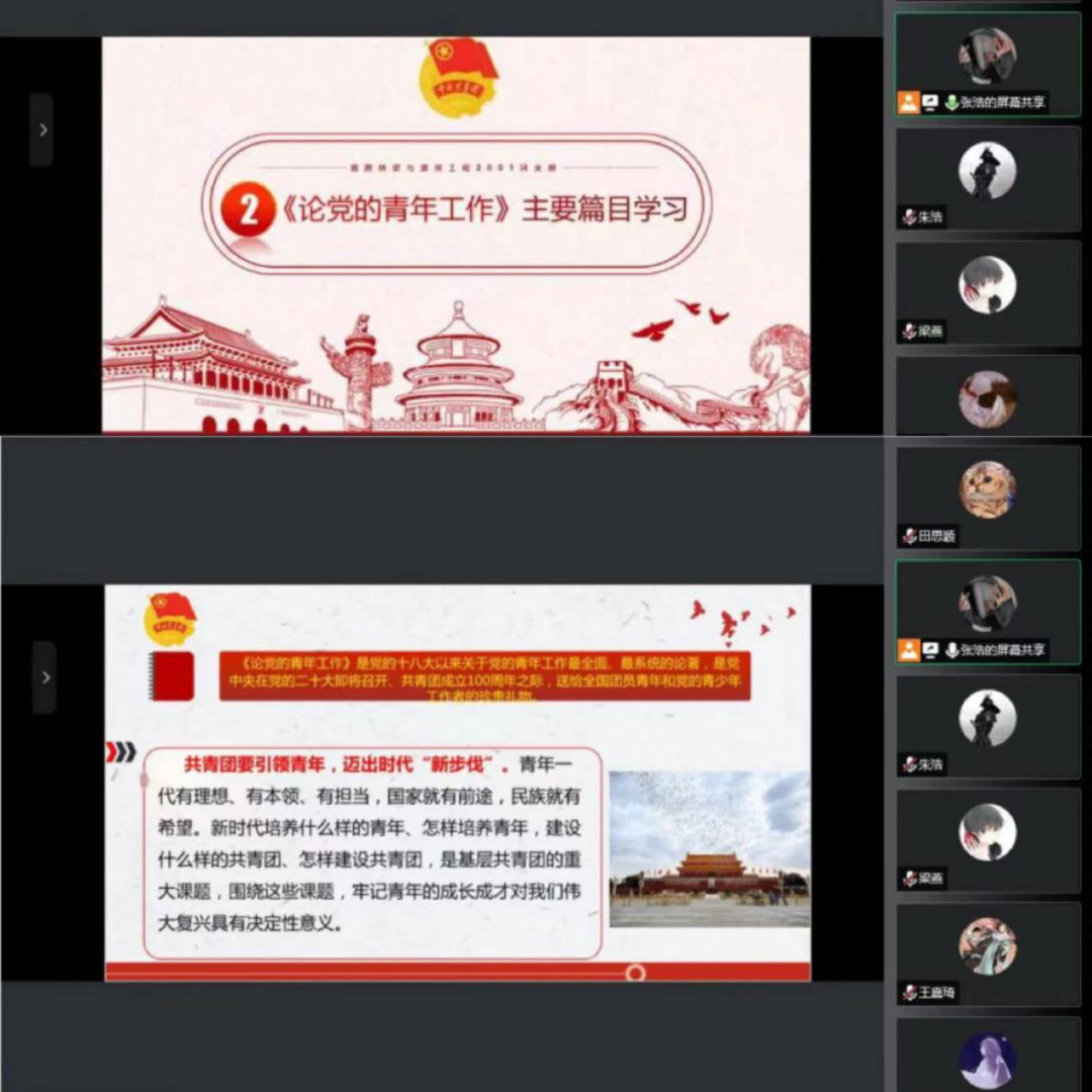 机电工程学院机械设计制造及其自动化1902团支部以领学和朗读分享的方式组织开展了《论党的青年工作》线上专题学习。团支部书记结合习总书记《在庆祝中国共产主义青年团成立100周年大会上的讲话》的重要论述和精神开展领学之后,支部成员摘选不同学习篇章进行朗读分享,结合自己的学习生活实际就学习篇章中的重要金句发表看法和心得。