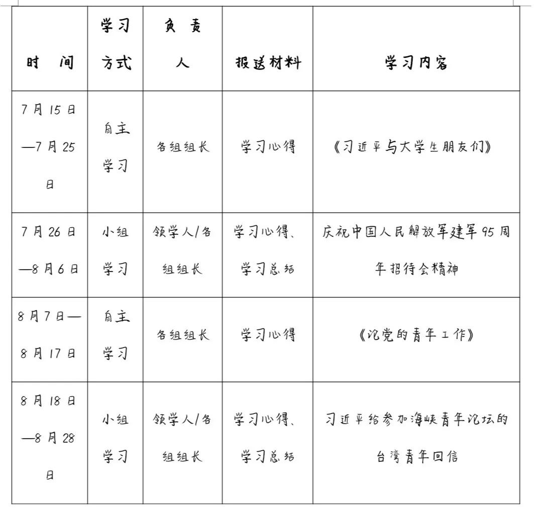 自7月15日起,本期培训班50名学员以10人为单位组成五个学习小组,每个学习小组配备一名兰州交通大学“点亮信仰 筑梦青马”理论普及宣讲团成员,以“三四四”的模式开展学习,即三种学习模式(自主学习、小组领学、集中研习)、四个学习周期(以10天为一周期)、四个学习板块(《习近平与大学生朋友们》重要思想、庆祝中国人民解放军建军95周年招待会精神、《论党的青年工作》、习近平给参加海峡青年论坛的台湾青年回信),共计40天,学员累计学习时长4500余小时,撰写心得体会共204份、读书笔记1000余页,录制课程500余分钟,参与讨论250余次。