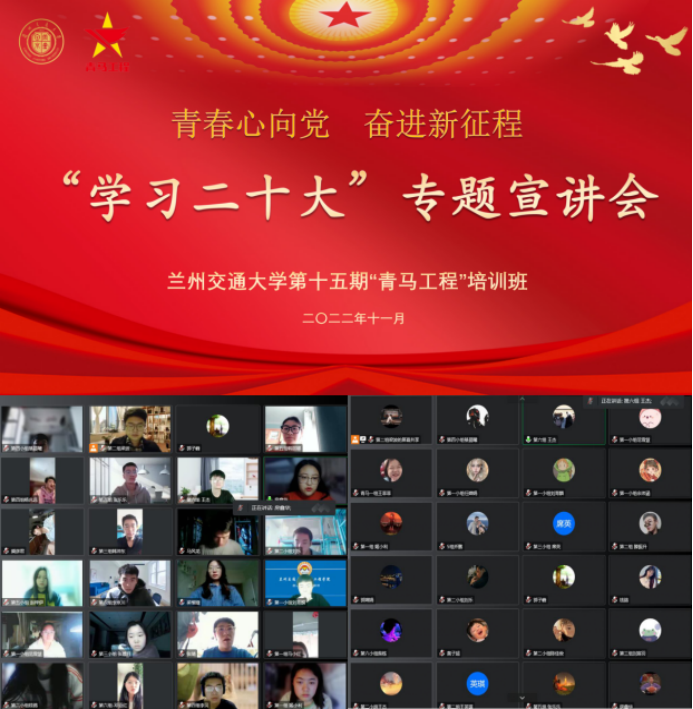 学习二十大,奋进新征程。为充分学习贯彻落实党的二十大的会议精神,用党的伟大精神引领新时代青年树立“青春心向党,奋进新征程”的时代思想,11月3日,兰州交通大学“青马宣讲团”深入第十五期“青马工程”培训班开展“学习二十大”专题宣讲会。