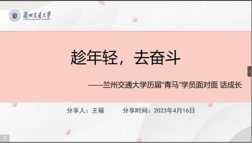 甘肃省“青马工程”省级高校示范班第四期、兰州交通大学第十三期“青马工程”培训班学员王硕则结合志愿服务和工作经历以“青年成长”的不同阶段为出发点,从“当好一名孩子”、“当好一名志愿者”、“当好一名学生”和“当好一名员工”四个部分讲述自己的故事,与“青马”学员分享经验,共话成长。