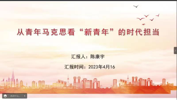 甘肃省“青马工程”省级高校示范班第一期、兰州交通大学第十期“青马工程”培训班学员陈康宇开展了以《从青年马克思看“新青年”的时代担当》为主题的交流宣讲。他从“何为时代担当”这一问题出发,结合自身青马学习经历引导“青马”学员作为新时代青年要不忘初心、牢记使命、谦虚谨慎、艰苦奋斗、敢于斗争、善于斗争!