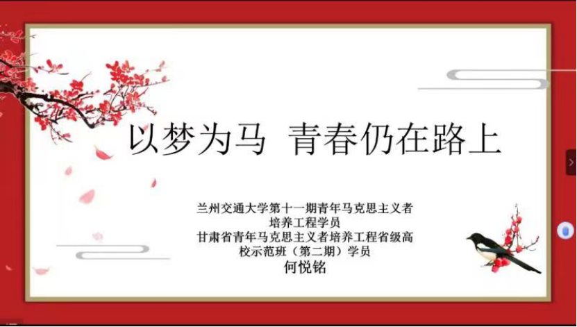 甘肃省“青马工程”省级高校示范班第二期、兰州交通大学第十一期“青马工程”培训班学员何悦铭开展了以《以梦为马,青春仍在路上》为主题的分享,她结合自身团学工作和实践经历,引导“青马”学员以青春之我、奋斗之我为民族复兴架桥铺路,为祖国发展增砖添瓦!