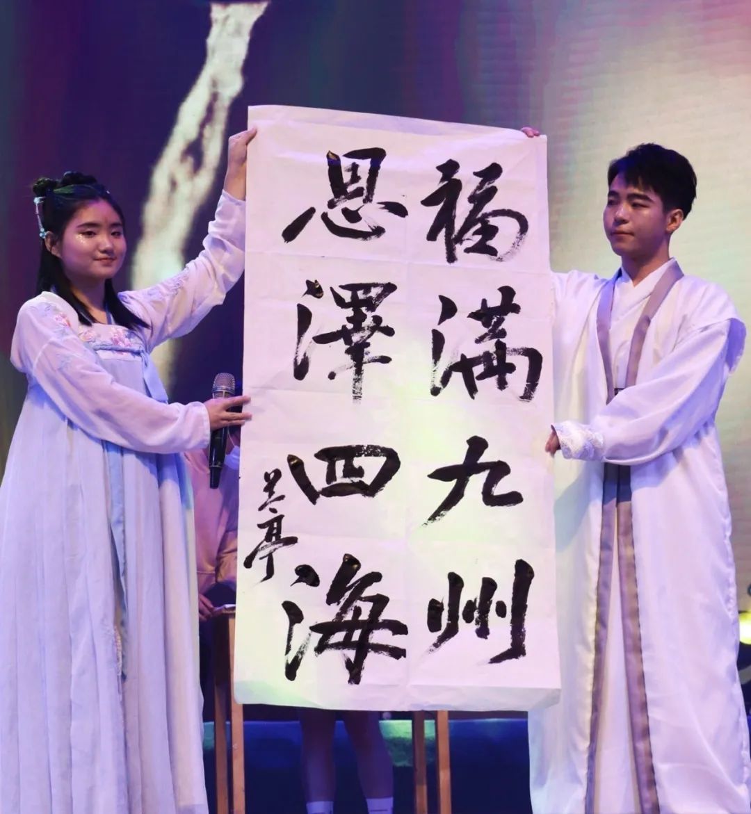 《燕归巢》邀请了我校兰亭书画协会的同学现场为观众书写了“福满九州、恩泽四海”,用自己的笔写出爱党、爱国的青年热情。